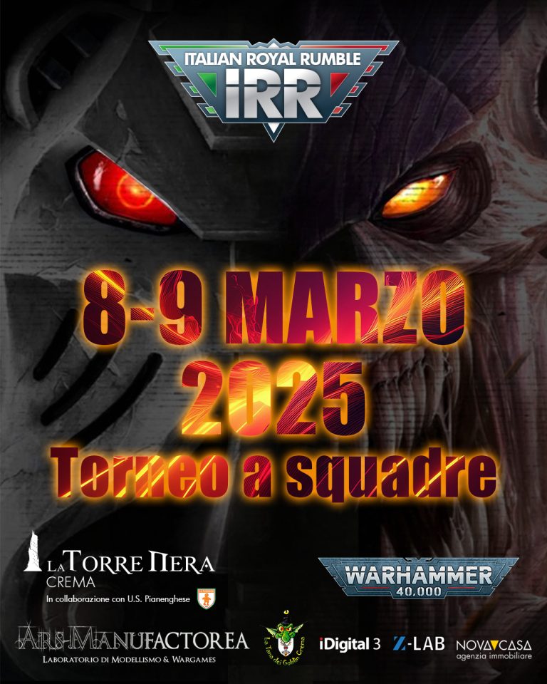 Il Torneo, a Squadre da 5 Giocatori, si terrà presso l’Unione Polisportiva Pianenghese (Pianengo – CR).  I vostri generali si sfideranno all’ultimo sangue per la conquista del titolo di MIGLIOR TEAM ITALIANO IRR di Warhammer 40K. Siete Pronti?? La Torre Nera APS si è fortemente impegnata per l’organizzazione di questo evento con l’intento di offrirvi un’esperienza unica!